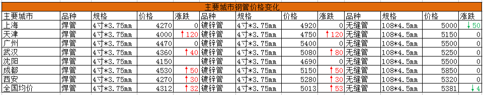 22日国内钢管价格走势分化,焊管、镀锌管小幅上涨,无缝管继续走弱。分品种来看,焊管4寸*3.75mm全国均价4312元/吨,较上一交易日上涨32元/吨;镀锌管4寸*3.75mm全国均价5013元/吨,较上一交易日上涨53元/吨;无缝管108*4.5mm全国均价5381元/吨,较上一交易日下跌4元/吨。具体情况如下: