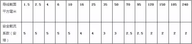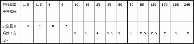 说明:口诀中的二点五下整九倍,升级减一顺序对是指导线截面在2.5平方毫米,每1平方毫米的安全电流为9安培,导线截面从2.5平方毫米以上,即4平方毫米开始线号每增大一等级,其安全电流减小1安培,直至2.5平方毫米为止;三十五线乘以三点五,双双成组减半倍是指导线截面35平方毫米每1平方毫米安全截流量为3.5安培,35平方毫米以上的导线,两个等级的线号为一组,安全电流减0.5安培,依次往上推算;高温九折,铜线升级,裸线加一半,导线穿管二、三、四、八、七、六折勿忘记是指导线穿管两条线应乘系数0.8,导线穿管三条线乘以系数0.7,导线穿管4条线乘以系数0.6。